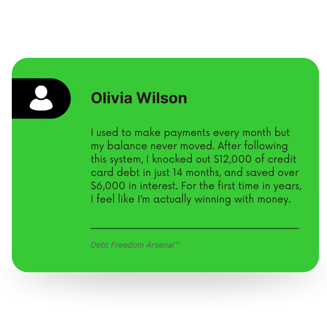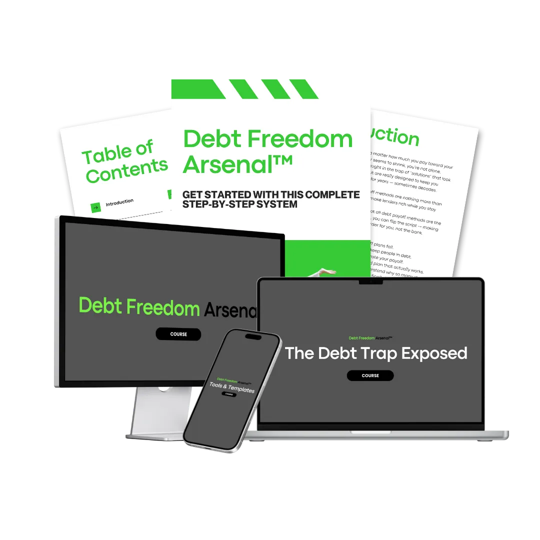 The Debt Freedom Arsenal™ is a complete PDF playbook that shows you how to eliminate debt using my proven 4-Account System. You'll get the exact budgeting method, debt elimination calculators, negotiation scripts, and AI tools I used to wipe out $20,347 in credit card debt in just 12 months. Everything is step-by-step, so you can copy my system exactly.